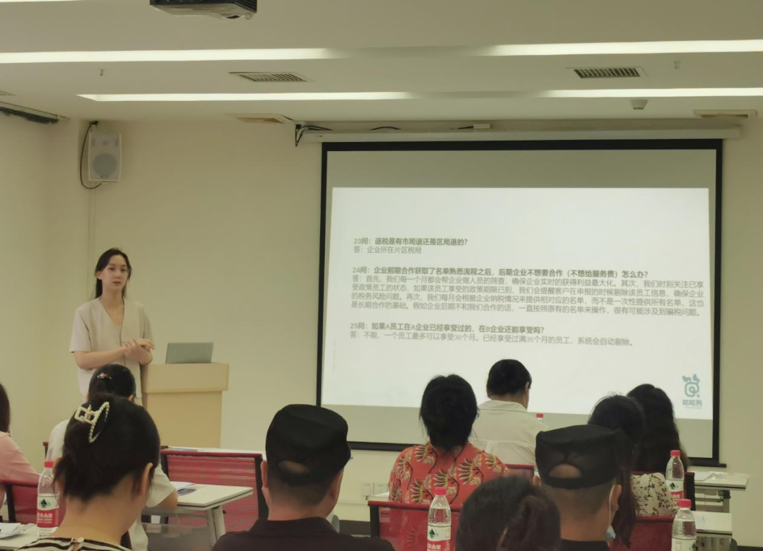 我们有幸邀约到咕咕狗的赵爽老师为企业做政策解读,会议上老师详细介绍了税收退税政策的相关内容,包括政策适用重点人群范围、税收优惠额度、项目介绍、申请条件、申请材料等,针对企业实际情况进行具体分析和解答,同时还通过申报成功的实例分享,让现场的企业代表真实感受到政策利好。
