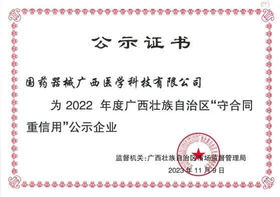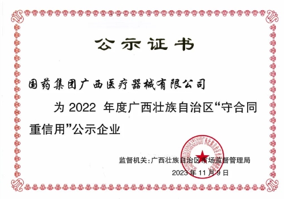 企业风采 | 园区入驻企业国药集团广西医疗器械有限公司及所属子公司获评2022年度广西壮族自治区“守合同 重信用”公示企业